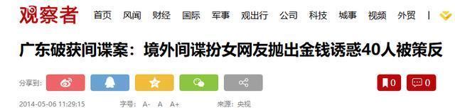 【3】观察者网--《广东破获间谍案:境外间谍扮女网友抛出金钱诱惑40人被策反》 https://www.guancha.cn/FaZhi/2014_05_06_227123.shtml