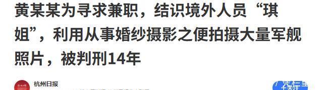 【2】杭州日报--《黄某某为寻求兼职,结识境外人员“琪姐”,利用从事婚纱摄影之便拍摄大量军舰照片,被判刑14年》 https://news.qq.com/rain/a/20250904A02WGW00